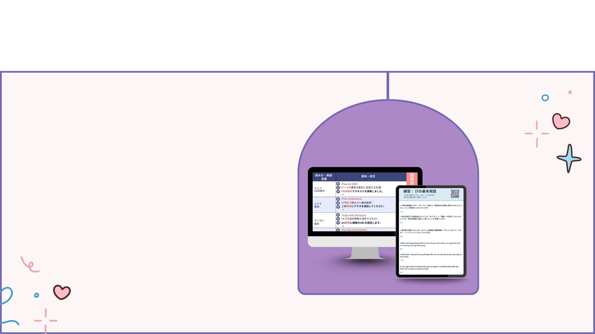 Từ vựng được chia theo từng phần, kèm nghĩa, giải thích tiếng Nhật và ví dụ ngắn giúp bạn luyện dịch và nhớ nhanh. Cuối mỗi chương có bài dịch IT thực chiến, kèm QR dẫn tới video TikTok để xem bản dịch mẫu và mẹo ghi nhớ. Học gọn – nhớ lâu – áp dụng ngay trong dự án Nhật.